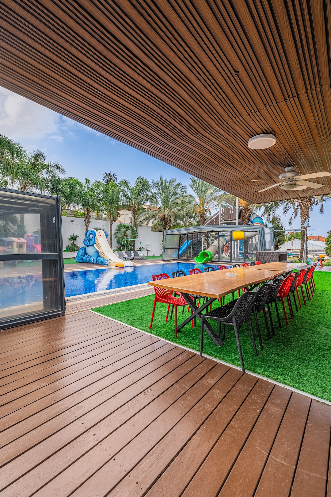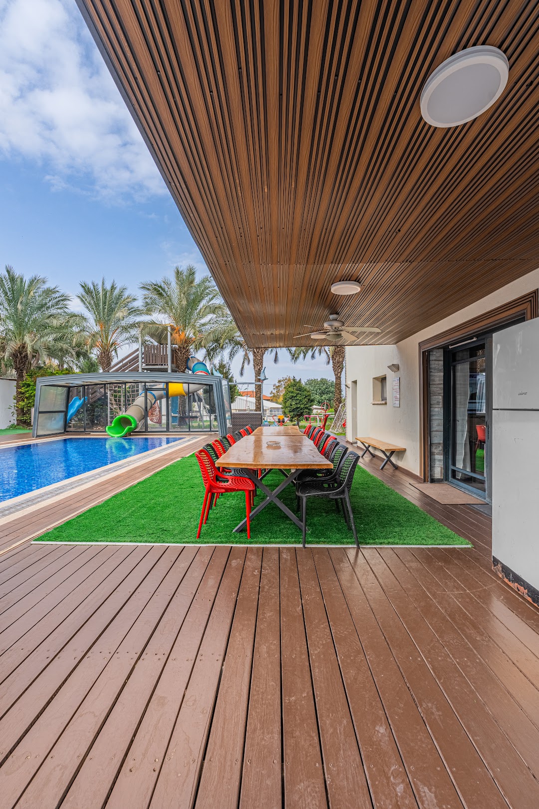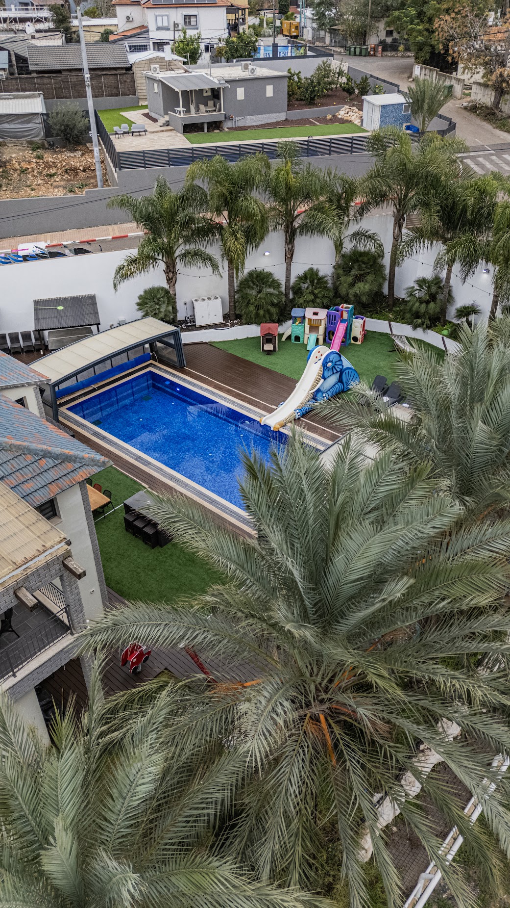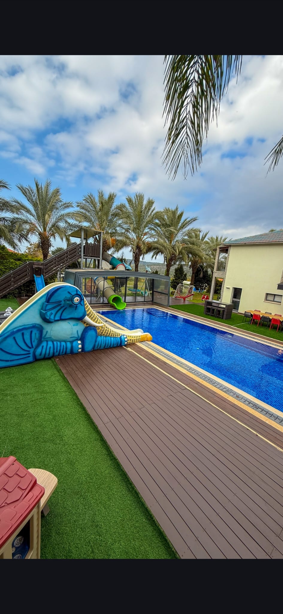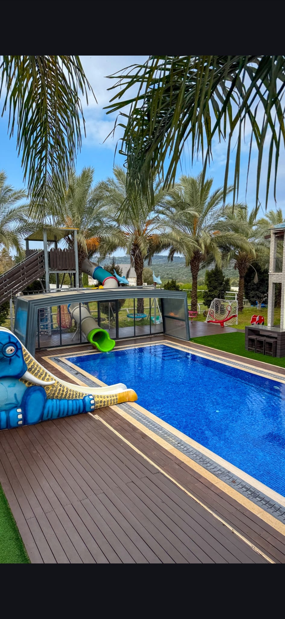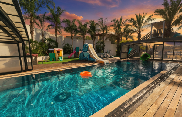 גולת הכותרת מגלשת ענק לבריכה בנויה  המותאמת לילדים ומבוגרים  כאחד( מחוממת ומקורה בעונת החורף).