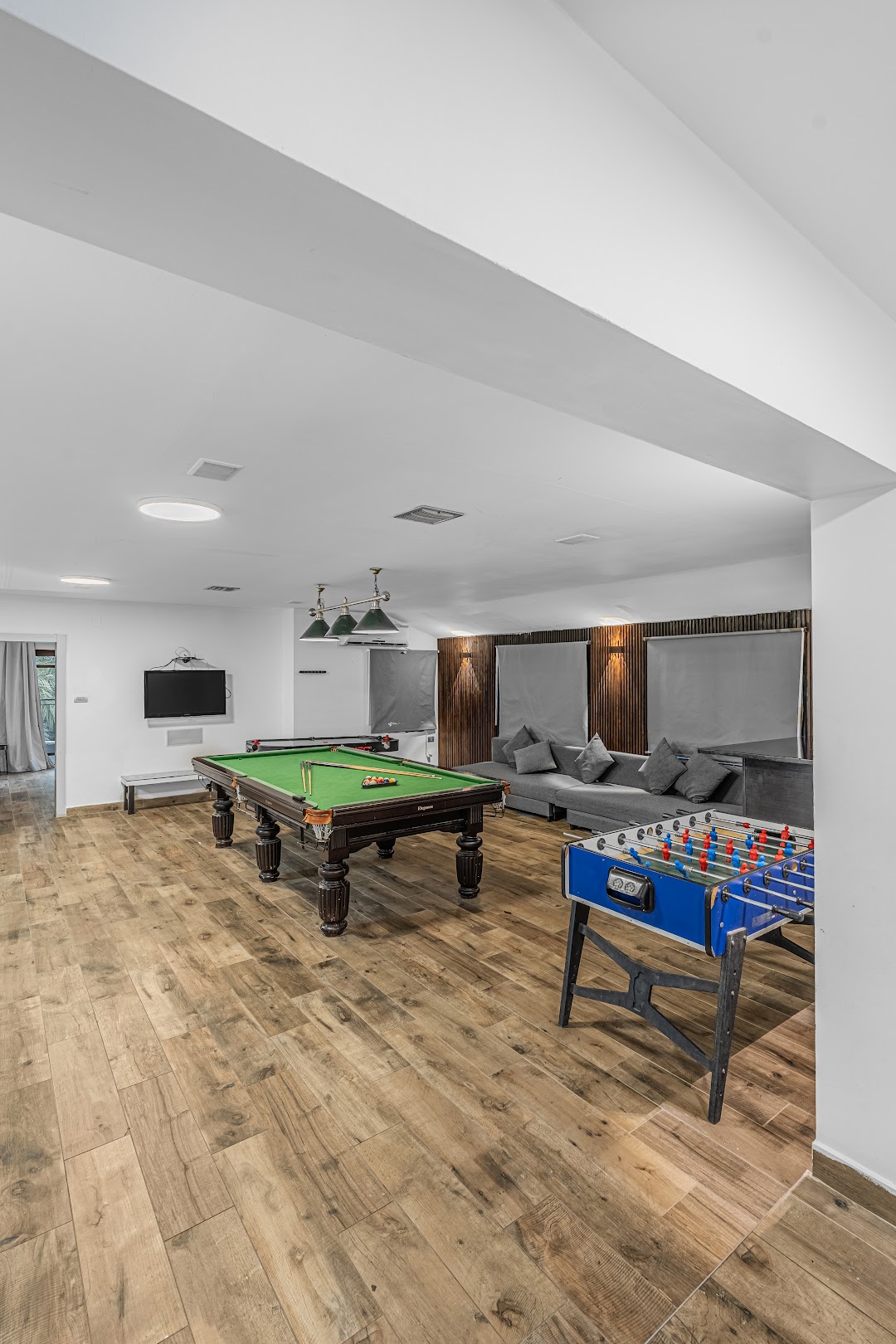 סלון הווילה ממתין לכם עם פינת ישיבה מפוארת, מסך טלוויזיה גדול 60 אינטש, ממיר עם מבחר ערוצים, מערכת סאונד בר, שולחן סנוקר בקומה העליונה, שולחן כדורגל והוקי אויר.